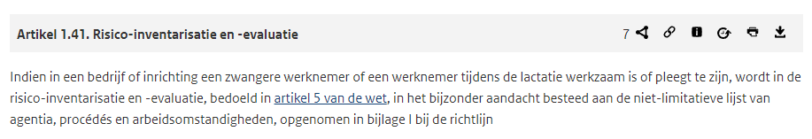 In bovenstaande figuur 1 zie je het hoofdartikel in het Arbobesluit. Dit verwijst naar bijlage 1 van een Richtlijn. Dat is de Europese richtlijn voor veiligheid gezondheid van werkende vrouwen die borstvoeding geven of werkende zwangere vrouwen.De arbeidshygiënische aspecten die beoordeeld moeten worden zijn: